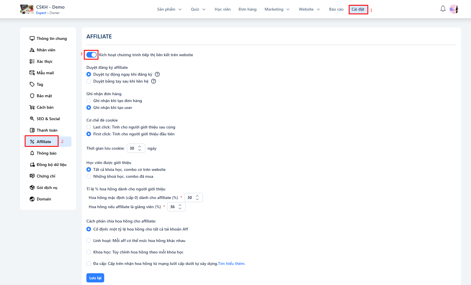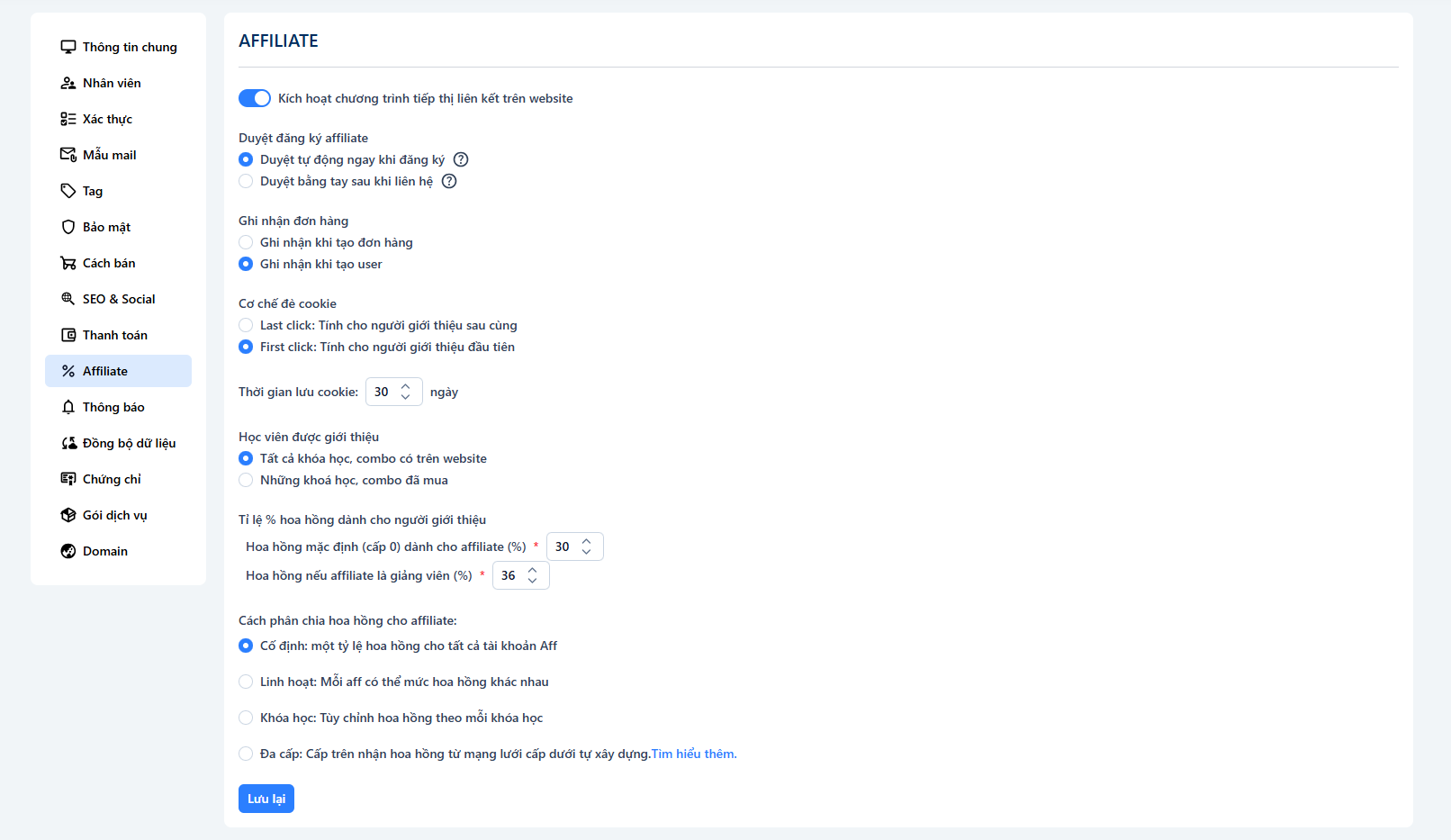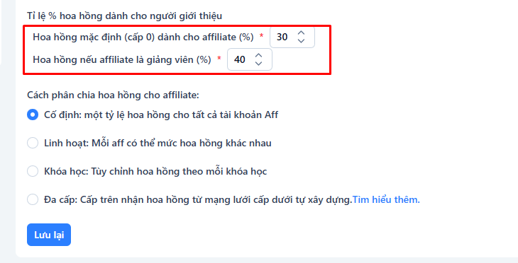 Hoa hồng nếu affiliate là giảng viên (%): Cho phép giảng viên giới thiệu khóa học của mình và nhận mức % riêng.