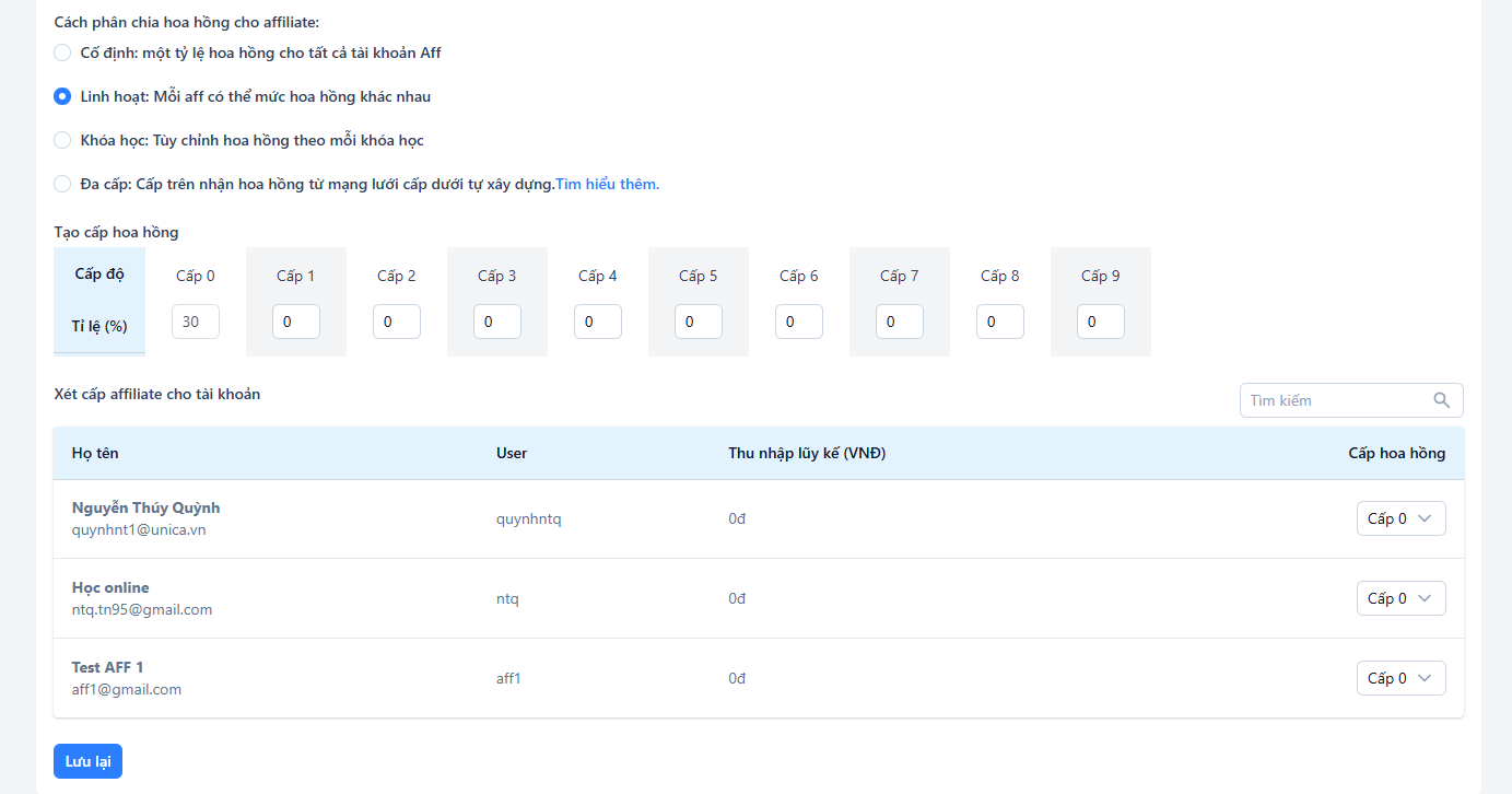 Quản trị viên có thể gán cấp hoa hồng cho từng người dùng trong danh sách Affiliate.