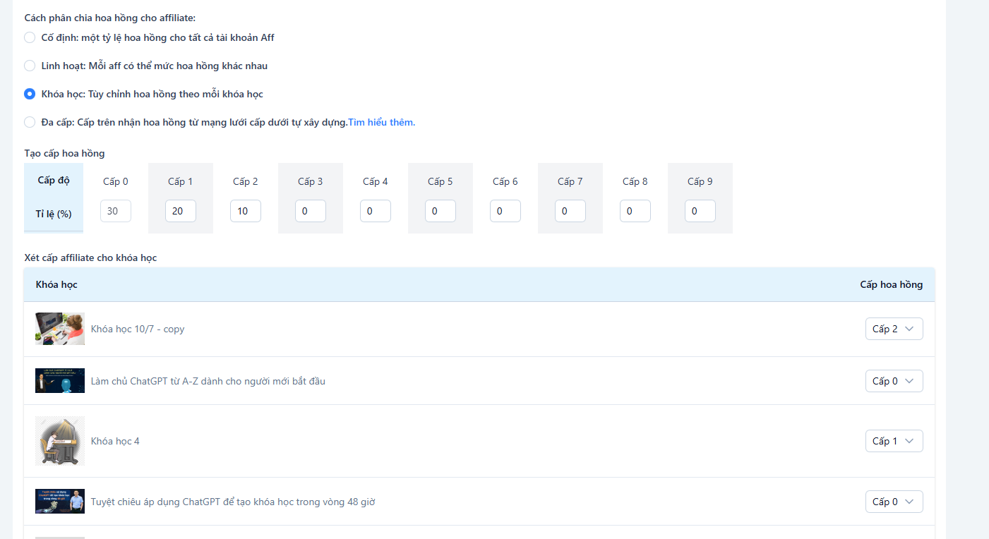 - Khóa học: Cài đặt tỉ lệ hoa hồng riêng cho từng khóa học.