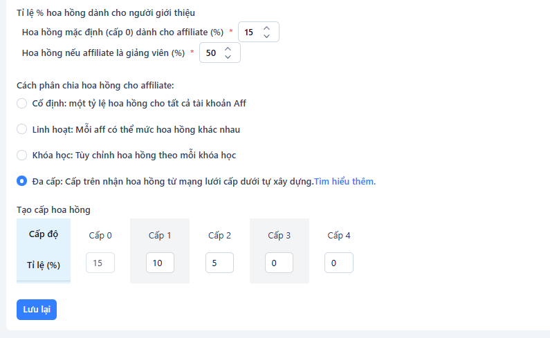 Mỗi cấp tương ứng với các mức % hoa hồng mà aff được nhận khi giới thiệu người mua khóa học đó (lưu ý Tỉ lệ hoa hồng các cấp phải nhỏ hơn hoặc bằng 80 và lớn hơn hoặc bằng 0). Cấp 0 sẽ cài đặt theo tỉ lệ % ở mục "Hoa hồng mặc định (cấp 0) dành cho affiliate(%)"