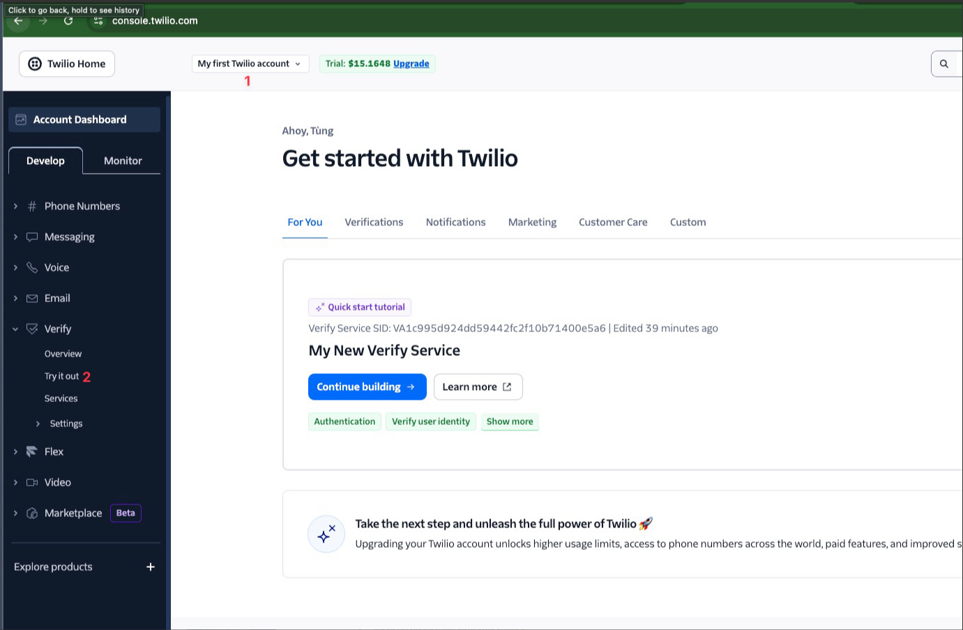 Bước 1: Bạn truy cập console.twilio.com -> My first Twilio account -> Try it out