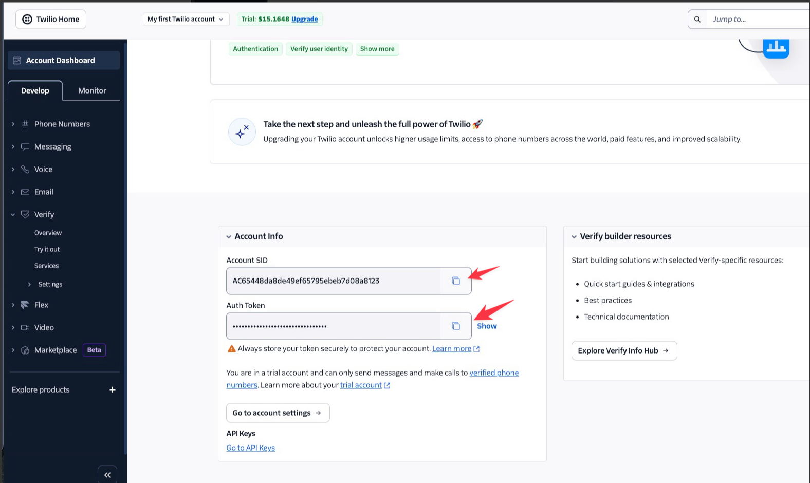 Bước 2: Kéo xuống lấy Account Info -> copy Account SID và Auth Token