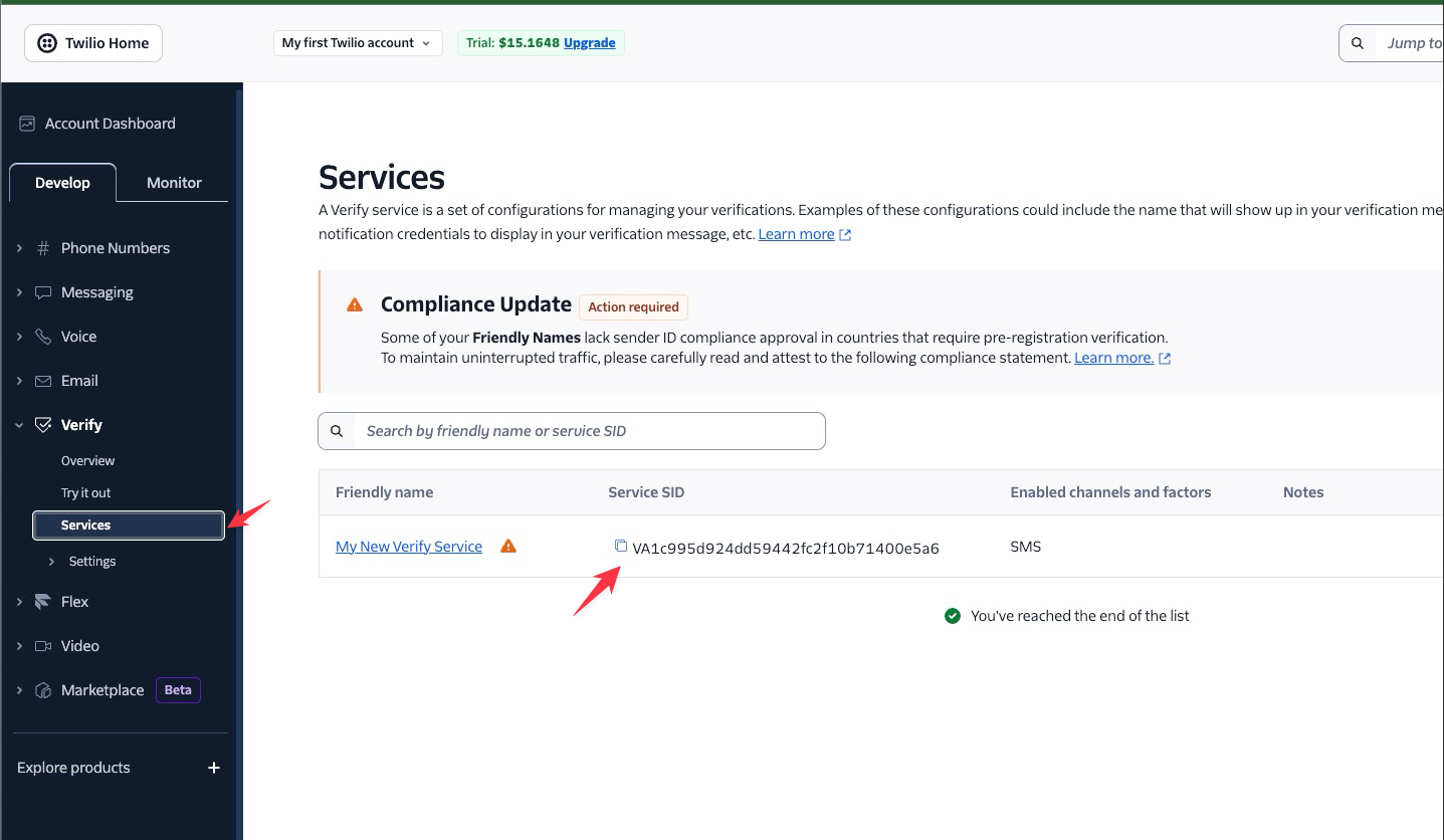 Bước 3: Truy cập Verify -> Services, sao chép Service SID