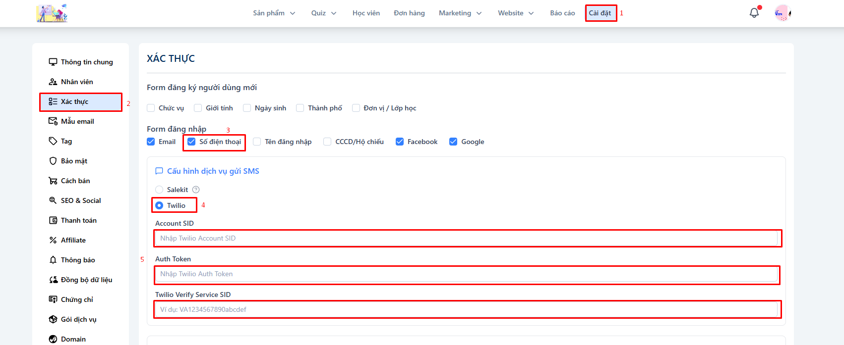 Bước 4: Truy cập trang website của bạn trên Edubit -> Vào menu Cài đặt -> Xác thực -> Số điện thoại -> twilio -> Nhập mã Account SID ; Auth Token và Service SID -> Nhấn Lưu lại là xong!